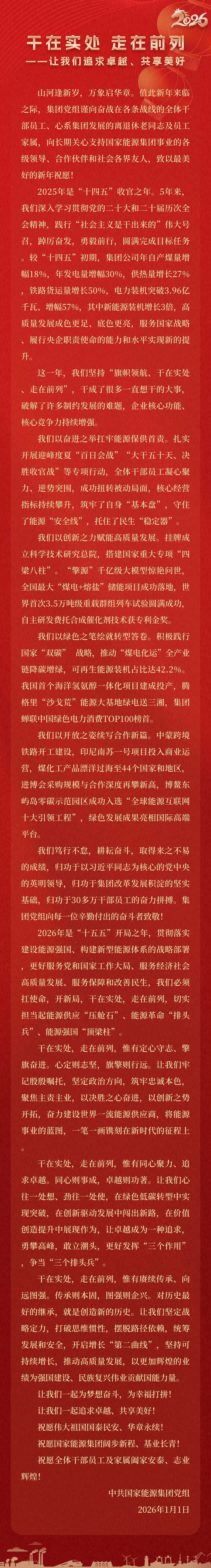 國家能源集團(tuán)胸懷“國之大者”,增產(chǎn)增供、穩(wěn)價穩(wěn)市,積極服從服務(wù)國家戰(zhàn)略、保障國家能源安全、助力國民經(jīng)濟(jì)穩(wěn)增長,推動煤炭安全綠色智能、煤電清潔高效穩(wěn)定、現(xiàn)代煤化工高端多元低碳、運輸物流協(xié)同一體、新能源多元創(chuàng)新規(guī)模化發(fā)展,全力擔(dān)當(dāng)能源強(qiáng)國頂梁柱,能源供應(yīng)壓艙石,能源革命排頭兵。